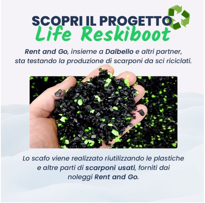 Dank unserer Zusammenarbeit mit Dalbello ist es in den Rent and Go Zentren möglich, die brandneuen und exklusiven grünen Skischuhe zu mieten, deren Schale aus recycelten Kunststoffen alter Skischuhe hergestellt wird, die wir bereitstellen.