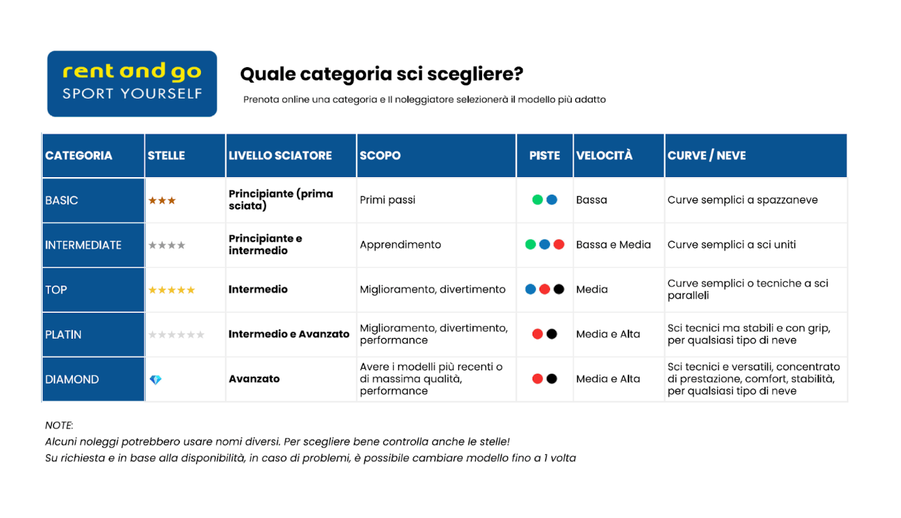 Ogni categoria di sci nel gruppo Rent and Go è identificata con un certo numero di stelle. Scopri qual è la categoria giusta per te, consultando la seguente tabella.
